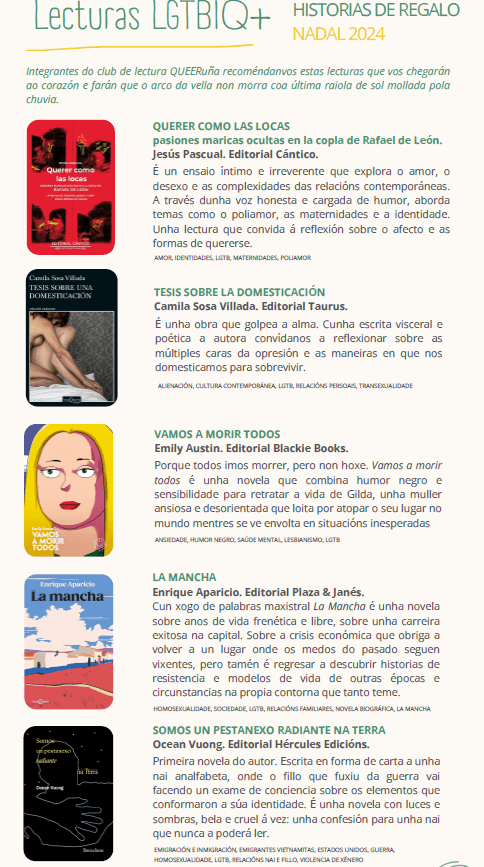Con este roteiro —unha colaboración entre a cooperativa Rexenarando, a historiadora Daniela Fernández e o Club de Lectura LGTB Queeruña—, as persoas participantes puideron coñecer estas historias nos seus contextos e recoñecelas nas nosas rúas, coa convicción de que son necesarias para construír igualdade e valorar a diversidade.