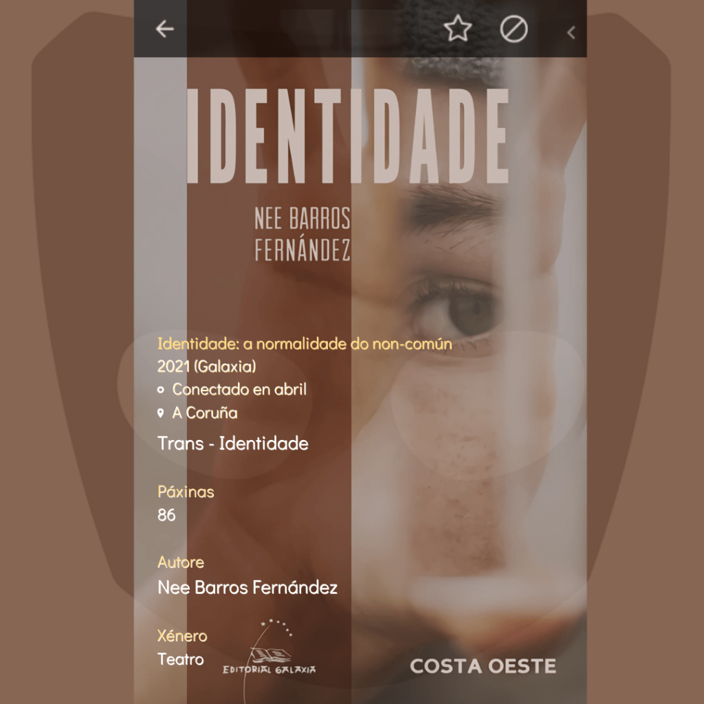 Hoxe activamos o Grindr Bibliotecario cunha obra de teatro creada por Nee Barros Fernández (Ourense, 2002): “Identidade: a normalidade do non-común”, un libro que quere reivindicar que todo o que se sae do común tamén é normal, e que todas esas persoas socialmente minorizadas e discriminadas pola súa identidade de xénero son normais e precisan ter a mesma representación na literatura que teñen as persoas que entran dentro da normatividade. Todas as persoas somos diferentes e a diversidade da riqueza ao noso mundo.