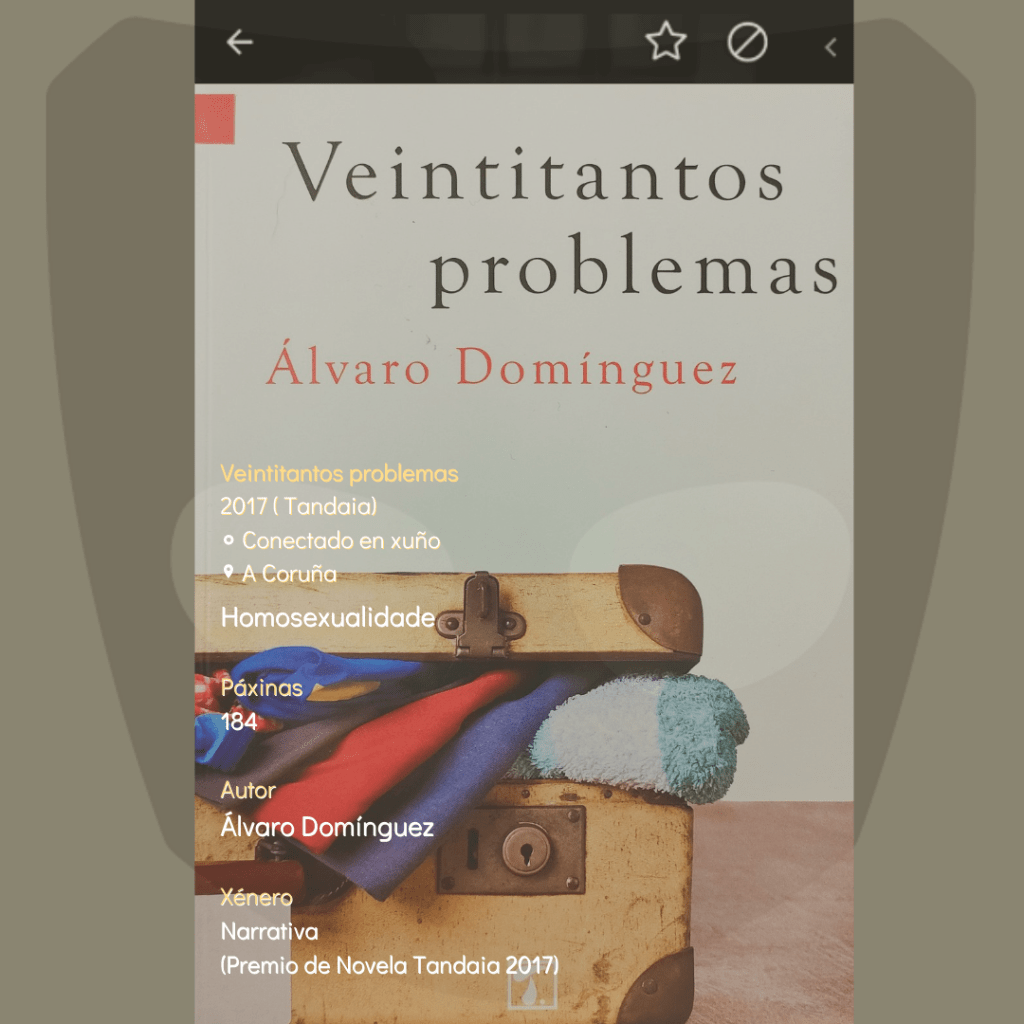 Hoxe o Grindr Bibliotecario actívase ca obra “Veintitantos problemas”, do autor pontevedrés Álvaro Domínguez, gañadora do Premio de Novela Tandaia no ano 2017. Esta é a historia de tres amigos de vintetantos anos que senten que a vida se lles ven grande ao darse conta de que a etapa universitaria chega á súa fin.